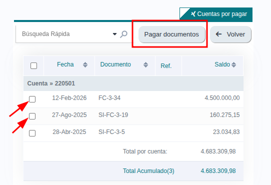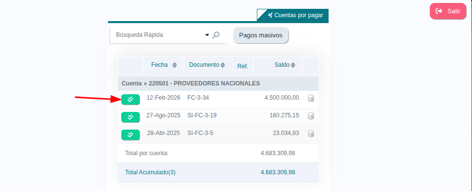 6. Si vamos a pagar una sola cuenta por pagar damos clic en el botón con los check.