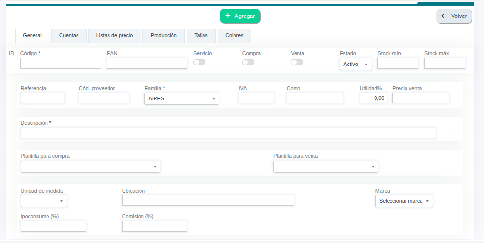3.6. Familia: Aquí debes asignar la categoria a la que pertenece el producto que vas a crea.