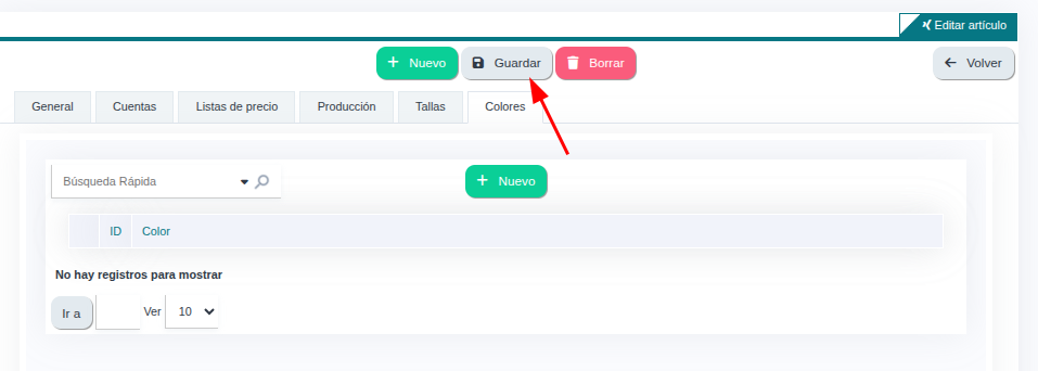 7. En la pestaña de Tallas y Colores puedes agregar las variantes en tallas y colores de tu producto. - Debes tener creadas las tallas y colores previamente desde Almacén -> Articulos -> Barra lateral -> Tallas / Colores