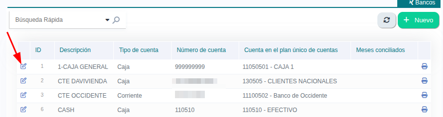 2. Dale clic sobre el icono del lapiz para editar un banco.